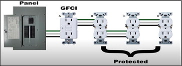 If the GFCI is placed in position A, it will also provide protection to the load side, or receptacles B, C and D. If instead, the GFCI is in position D, it will not provide protection to receptacles A, B, and C.